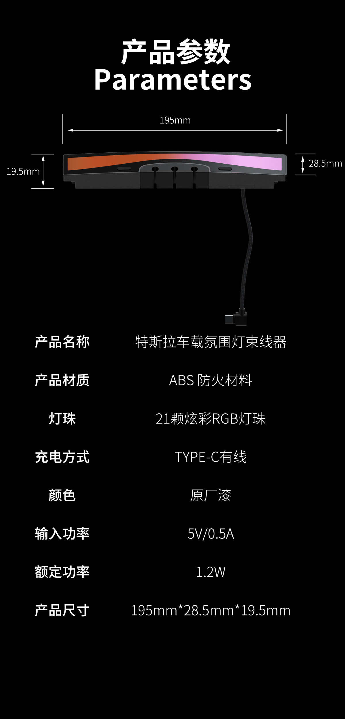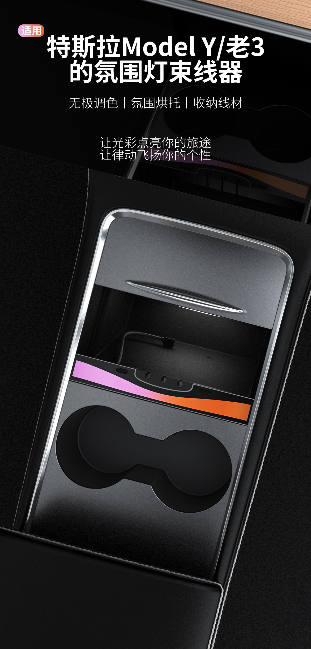 适用于特斯拉model3/Y拓展坞充电氛围灯中控转换头车载
